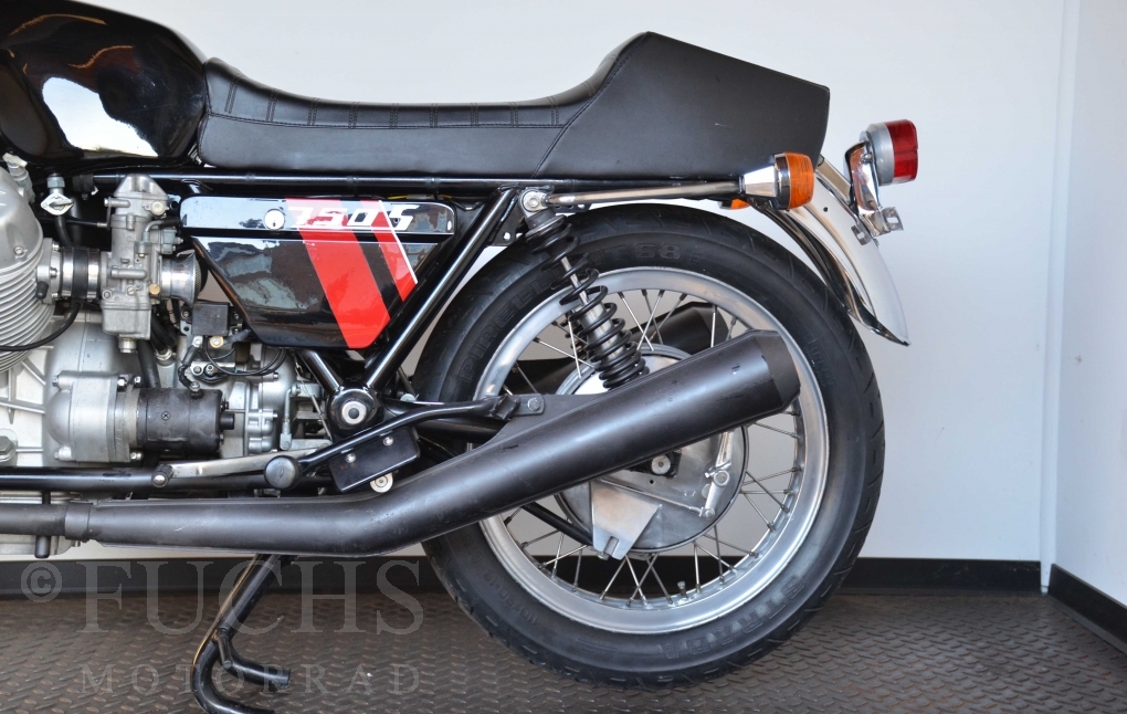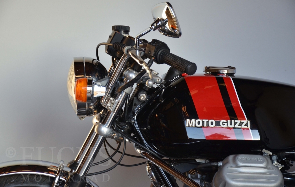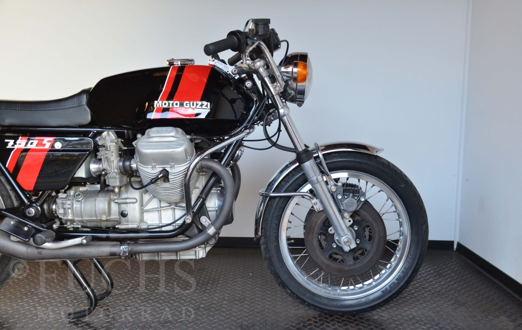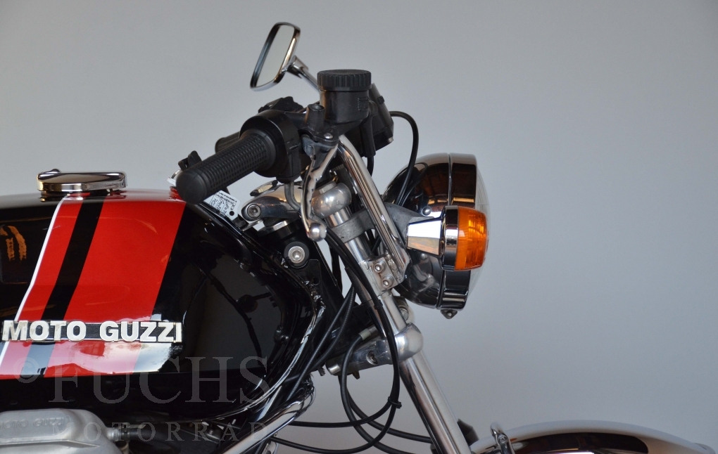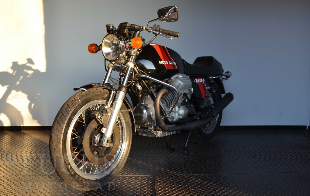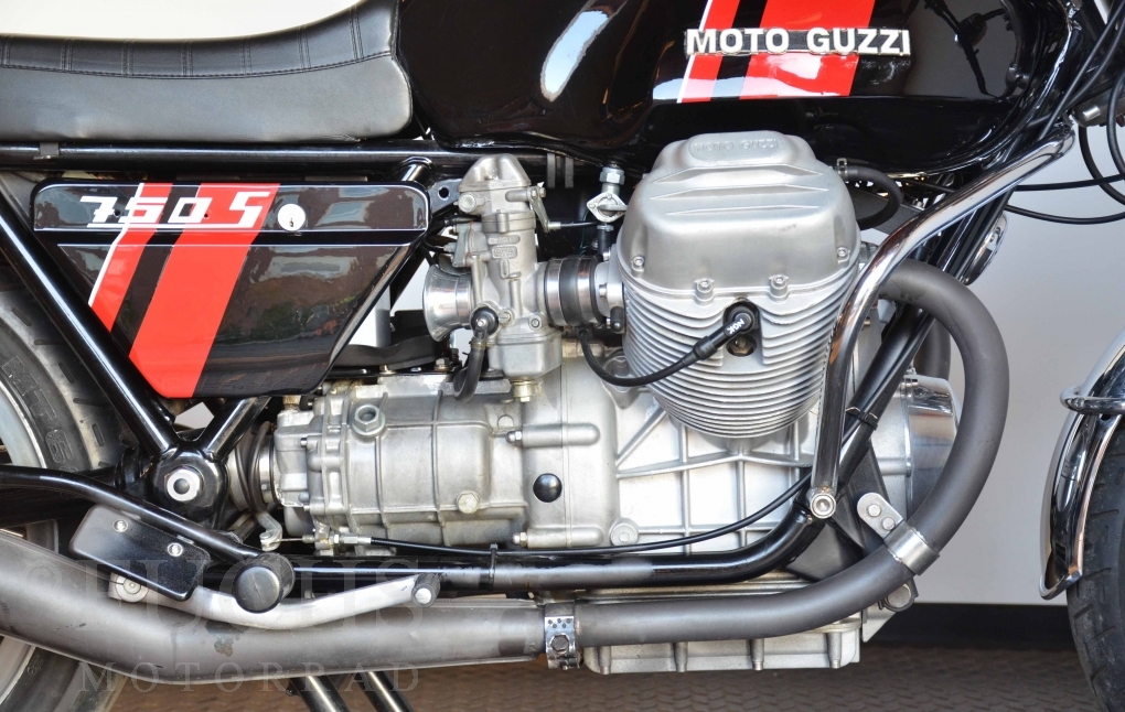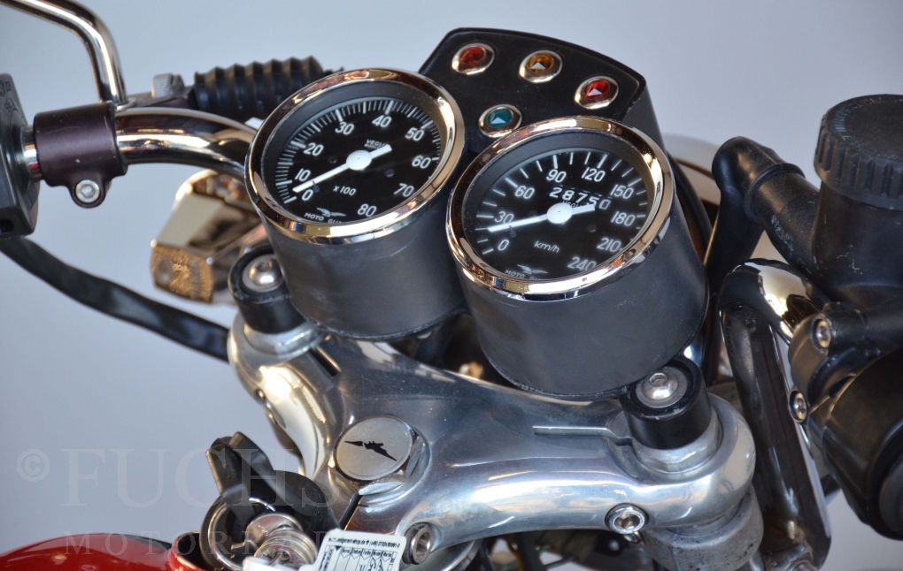 A few years ago, this Moto Guzzi 750 S was overhauled and restored. Since then, the machine has been moved regularly. Due to the short construction time and the low number of pieces, the 750 S has been a collectors item for many years. But to fill this status, the Guzzi needs a lot of details. First, we have a German vehicle registration. The engine and chassis numbers match. But also important are the Borrani rims, the gooseneck handlebars, the side covers with the boxes behind them, the footpeg shots, the instruments. There are deviations at a switch on the handlebar, the shock absorbers and the exhaust system. Another Chrome exhaust is also part of our package. so that we can offer a good 750 S with a very high degree of originality. It is essential that the engine is running very well.