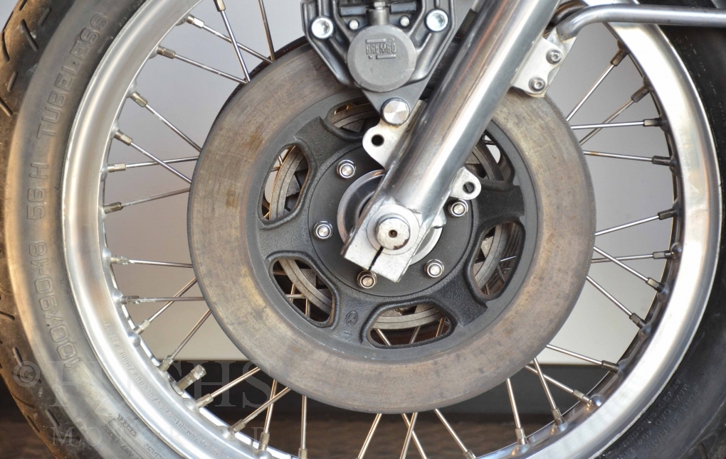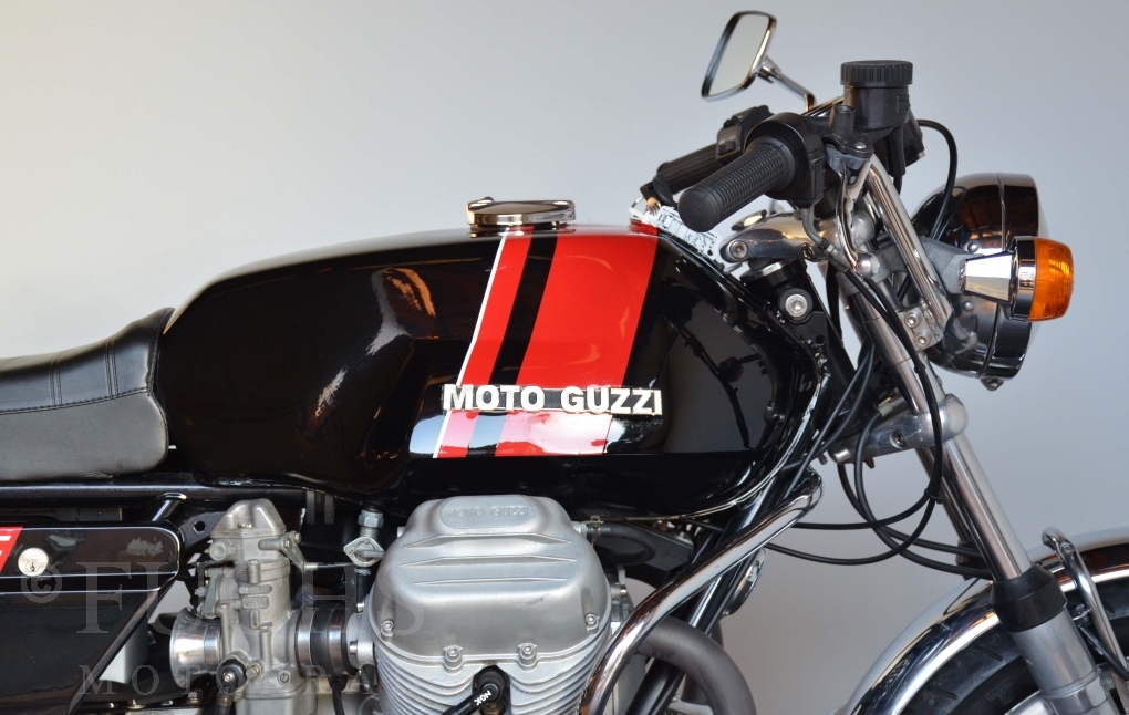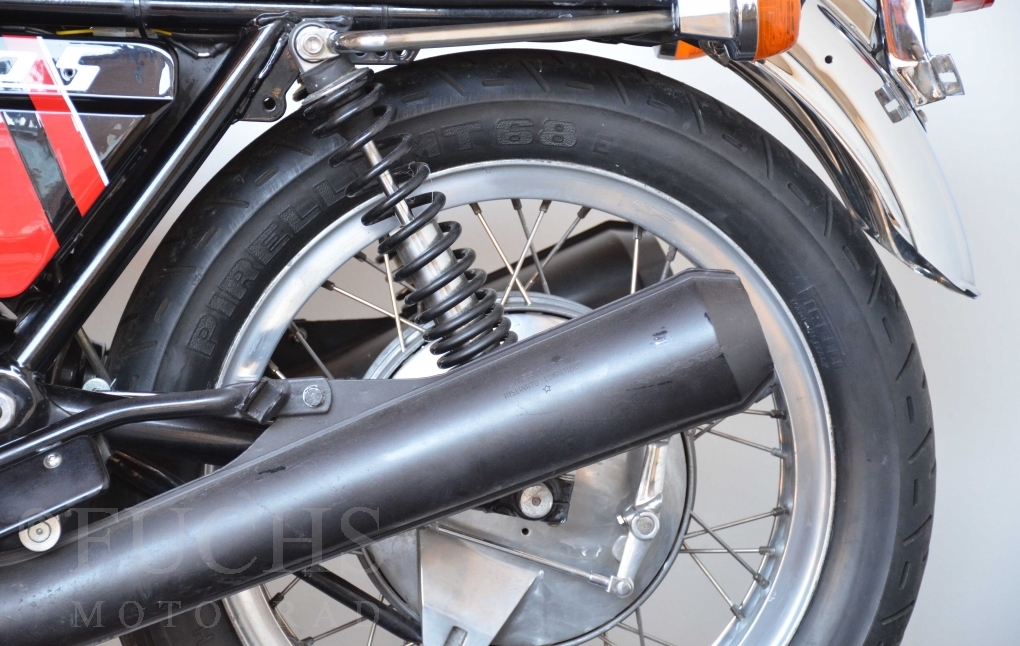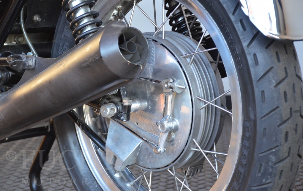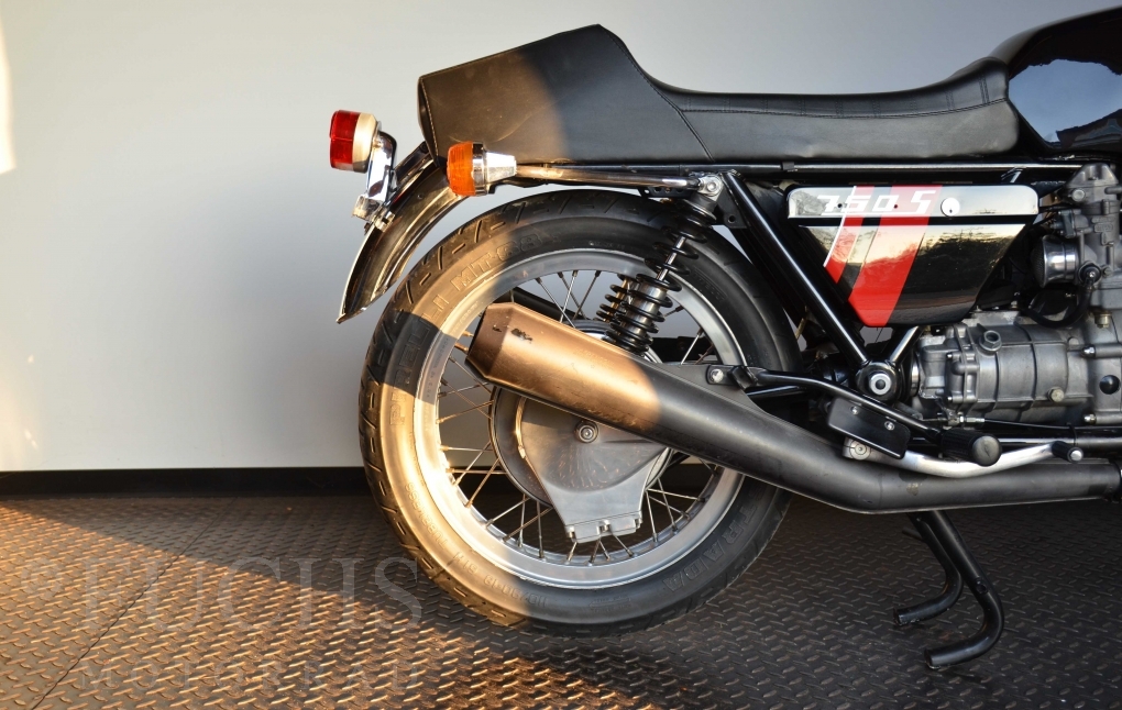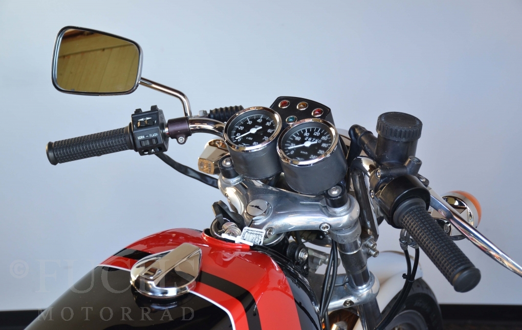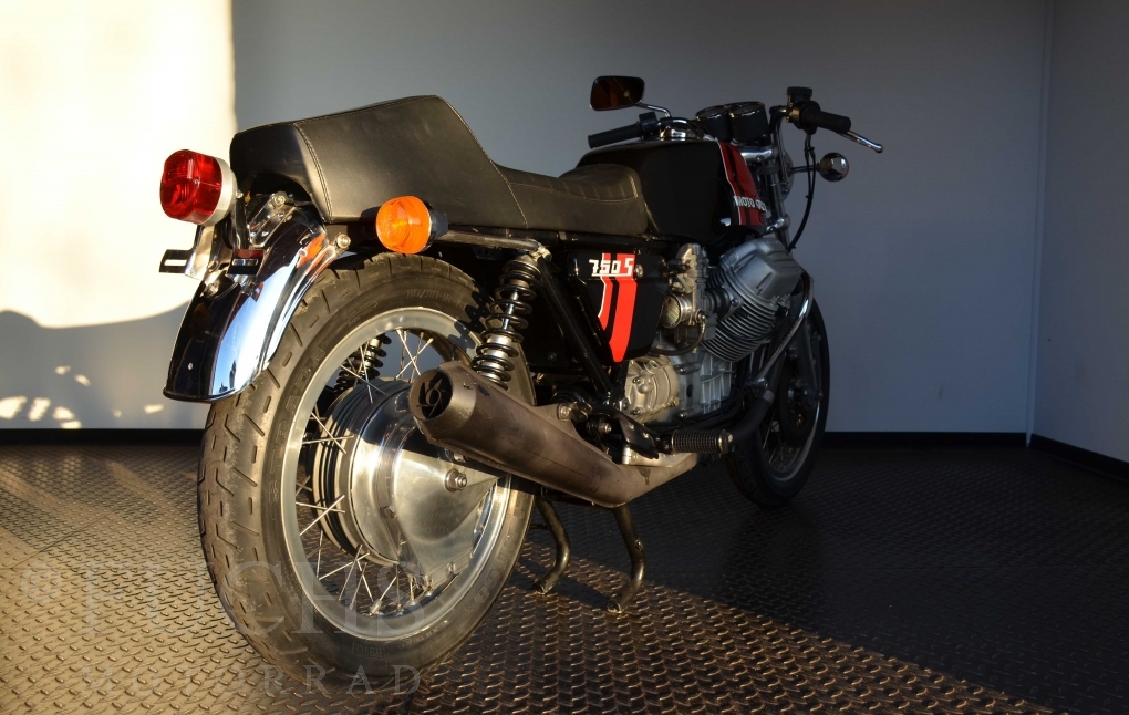 A few years ago, this Moto Guzzi 750 S was overhauled and restored. Since then, the machine has been moved regularly. Due to the short construction time and the low number of pieces, the 750 S has been a collectors item for many years. But to fill this status, the Guzzi needs a lot of details. First, we have a German vehicle registration. The engine and chassis numbers match. But also important are the Borrani rims, the gooseneck handlebars, the side covers with the boxes behind them, the footpeg shots, the instruments. There are deviations at a switch on the handlebar, the shock absorbers and the exhaust system. Another Chrome exhaust is also part of our package. so that we can offer a good 750 S with a very high degree of originality. It is essential that the engine is running very well.