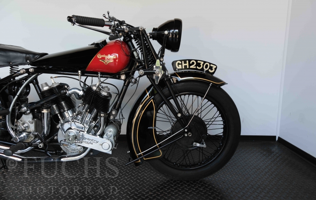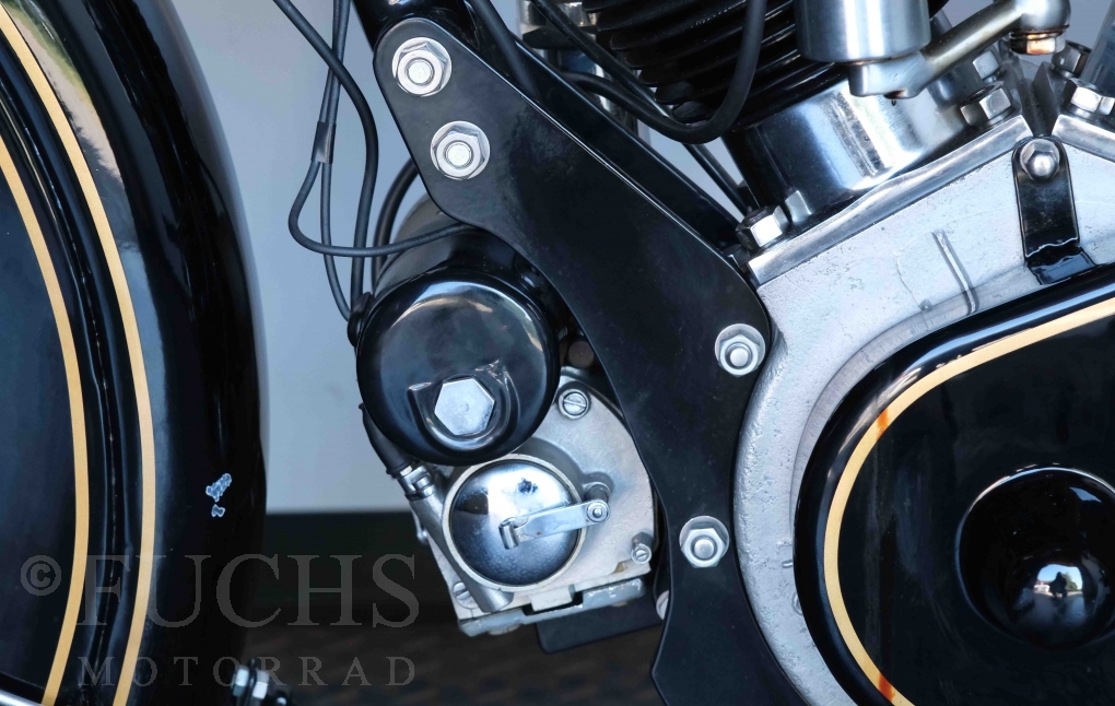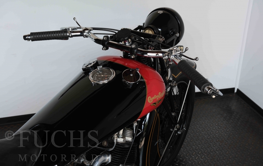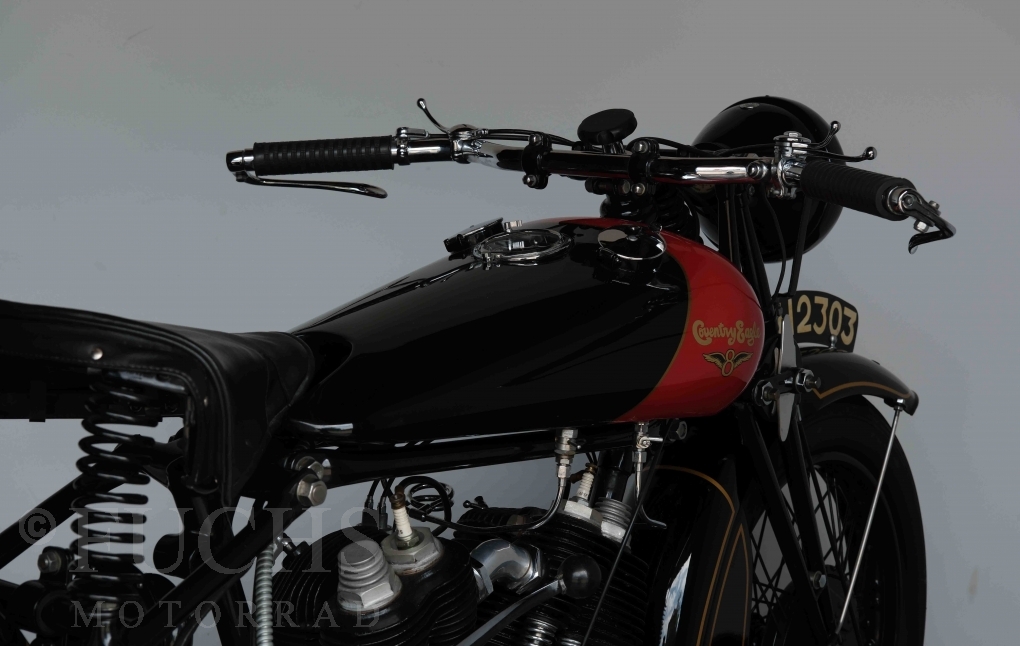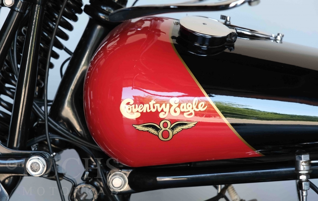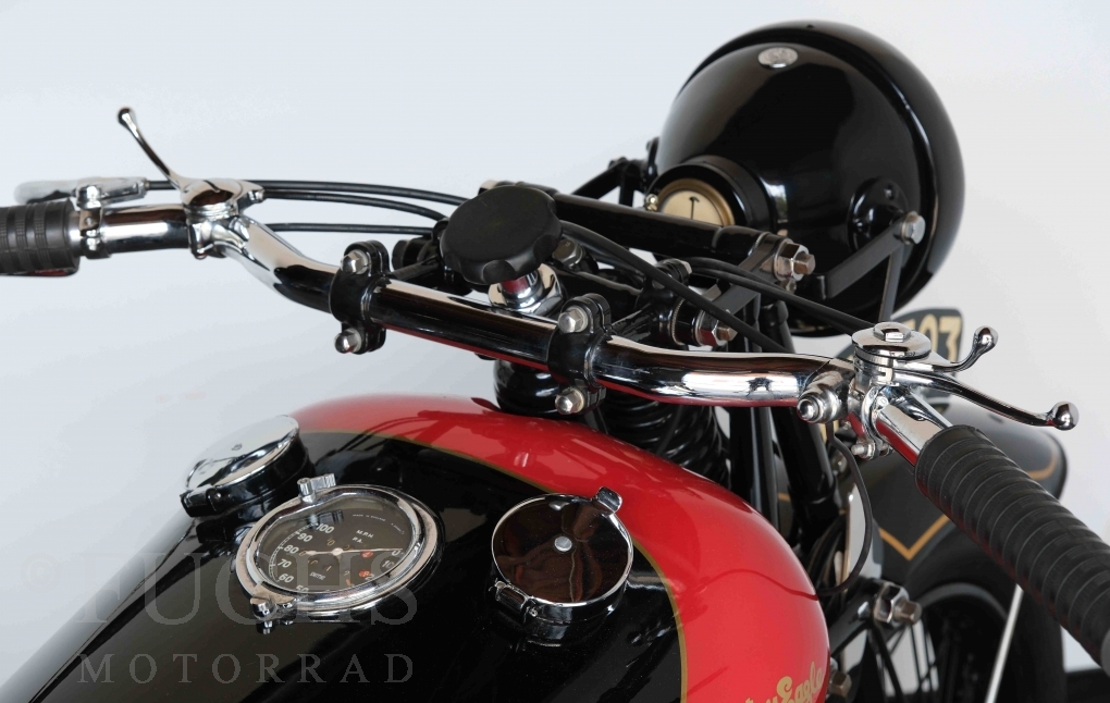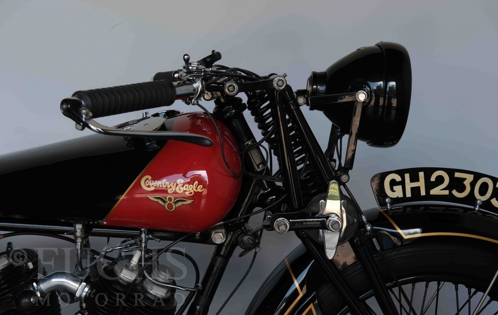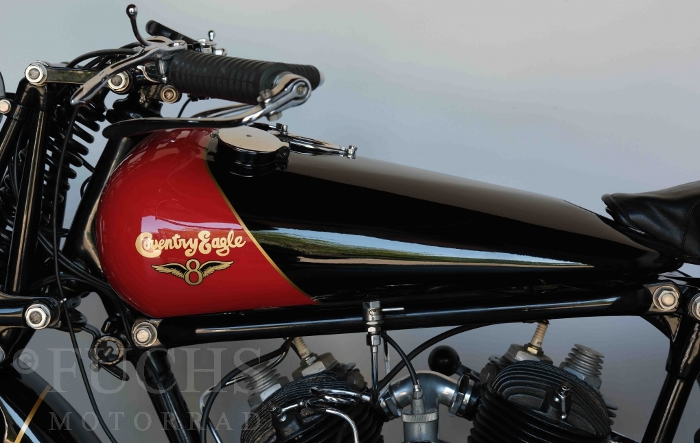 Undisputedly, the manufacturer Coventry Eagle is considered one of the best motorcycle producers in the 20s. The Flying Eight has become a celebrity. Good examples are very rare to find in the world market. The rounded tank reveals a certain kinship with the Brough Superior models. One of the reasons is that employees of Brough Superior moved to Coventry Eagle. The entrepreneurial goal to establish itself as a manufacturer of luxury motorcycles could not be realized. The production had to be stopped in 1945. All the more we are pleased to be able to offer this beautiful rarity.