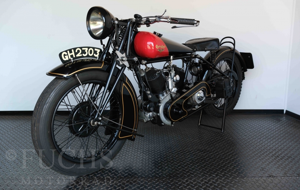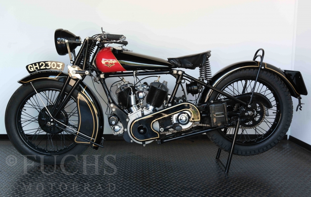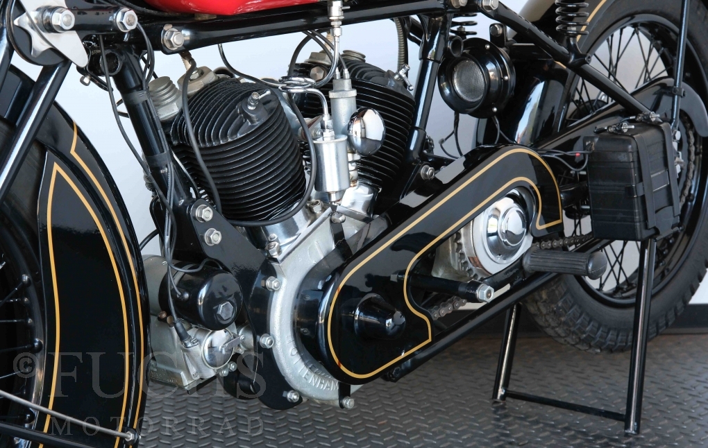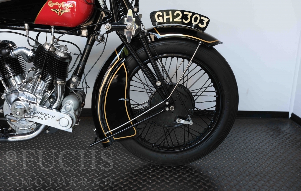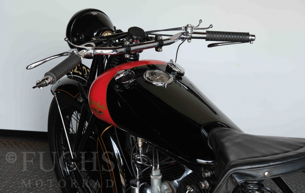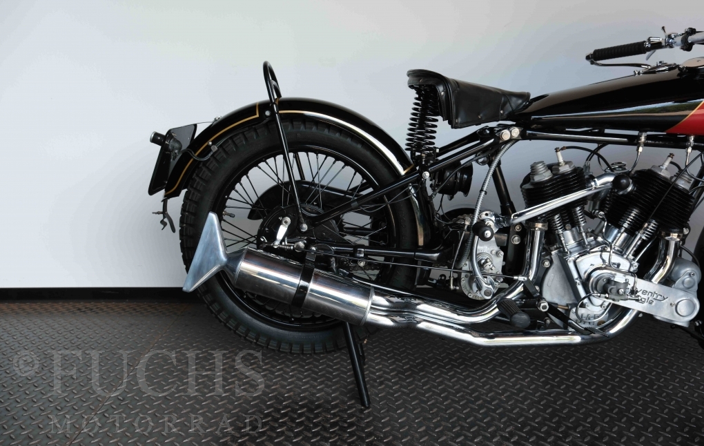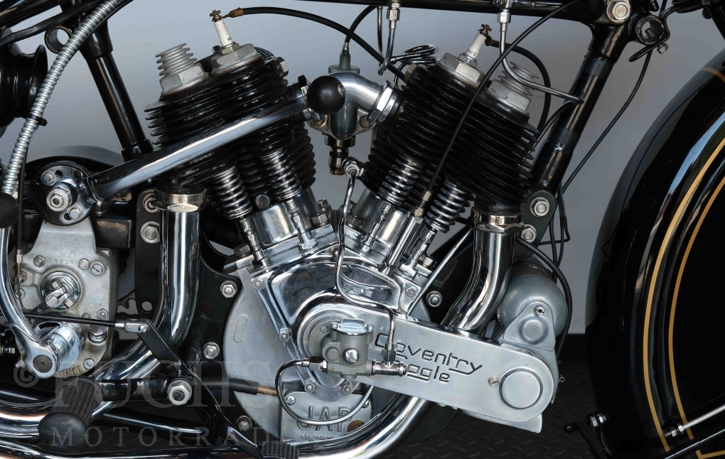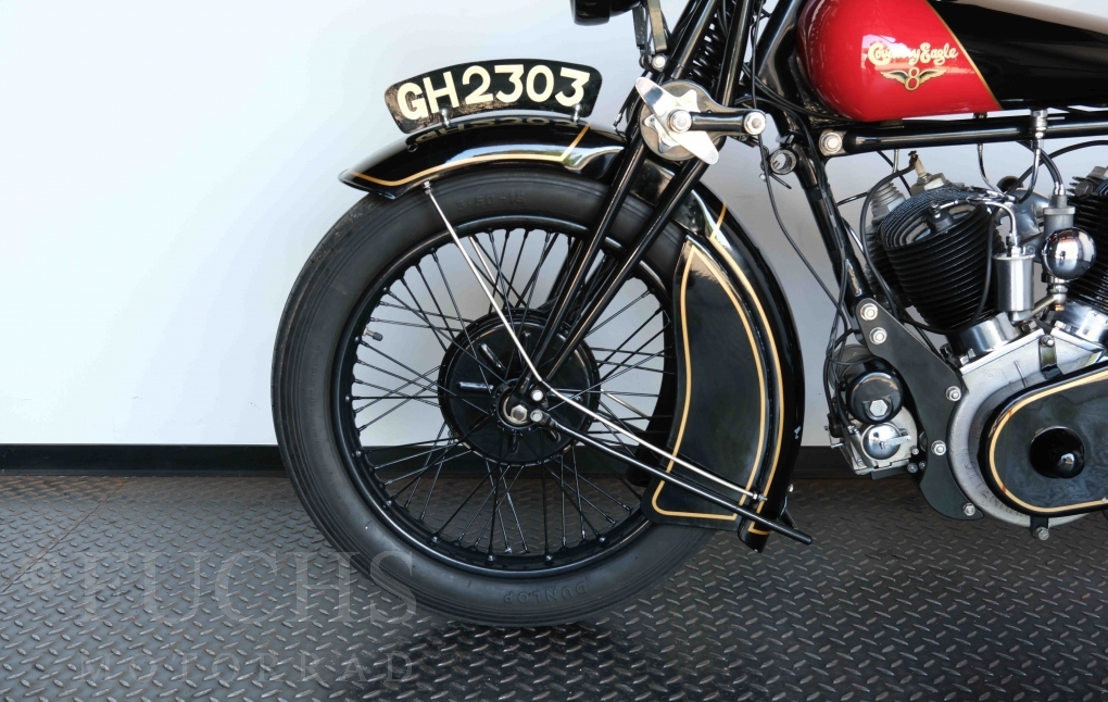 Undisputedly, the manufacturer Coventry Eagle is considered one of the best motorcycle producers in the 20s. The Flying Eight has become a celebrity. Good examples are very rare to find in the world market. The rounded tank reveals a certain kinship with the Brough Superior models. One of the reasons is that employees of Brough Superior moved to Coventry Eagle. The entrepreneurial goal to establish itself as a manufacturer of luxury motorcycles could not be realized. The production had to be stopped in 1945. All the more we are pleased to be able to offer this beautiful rarity.
