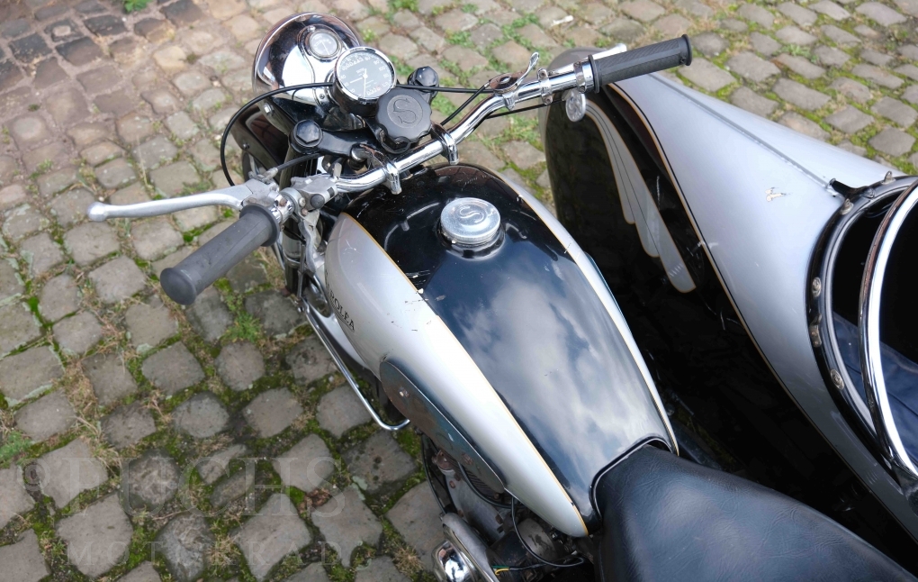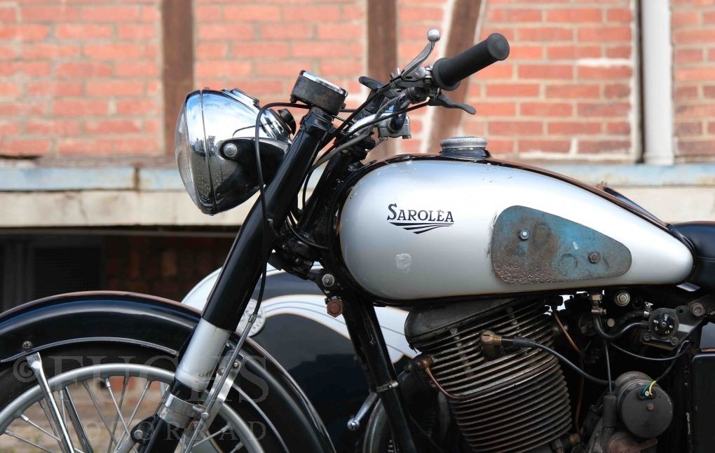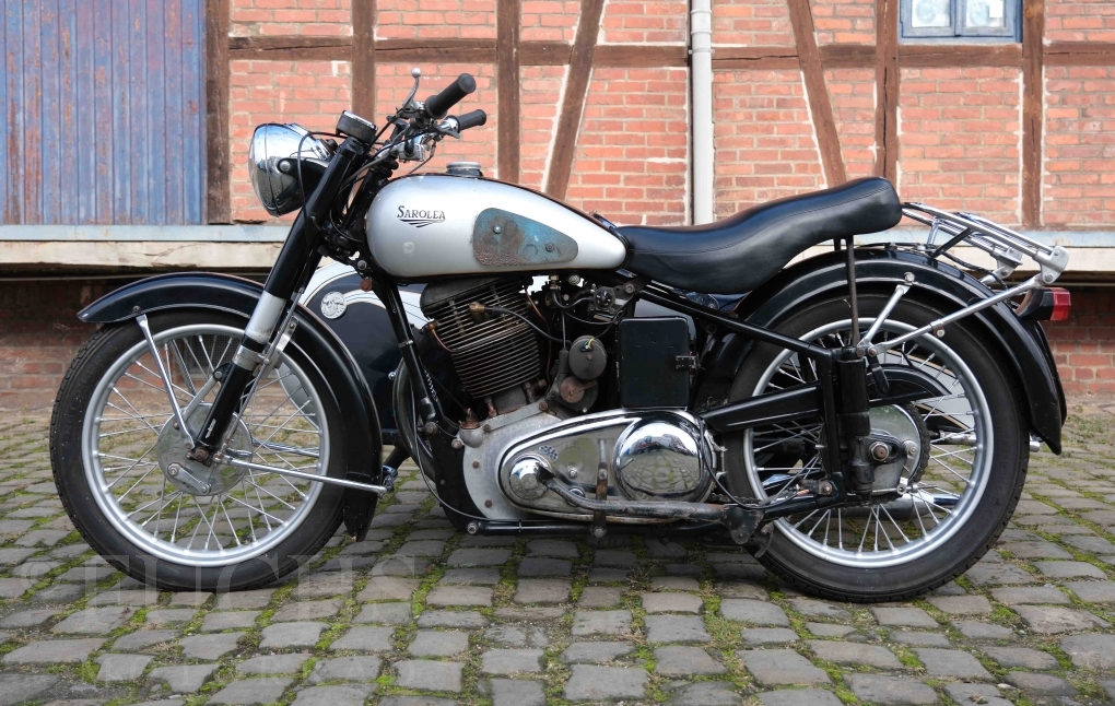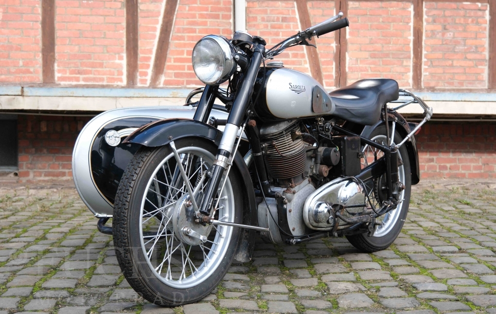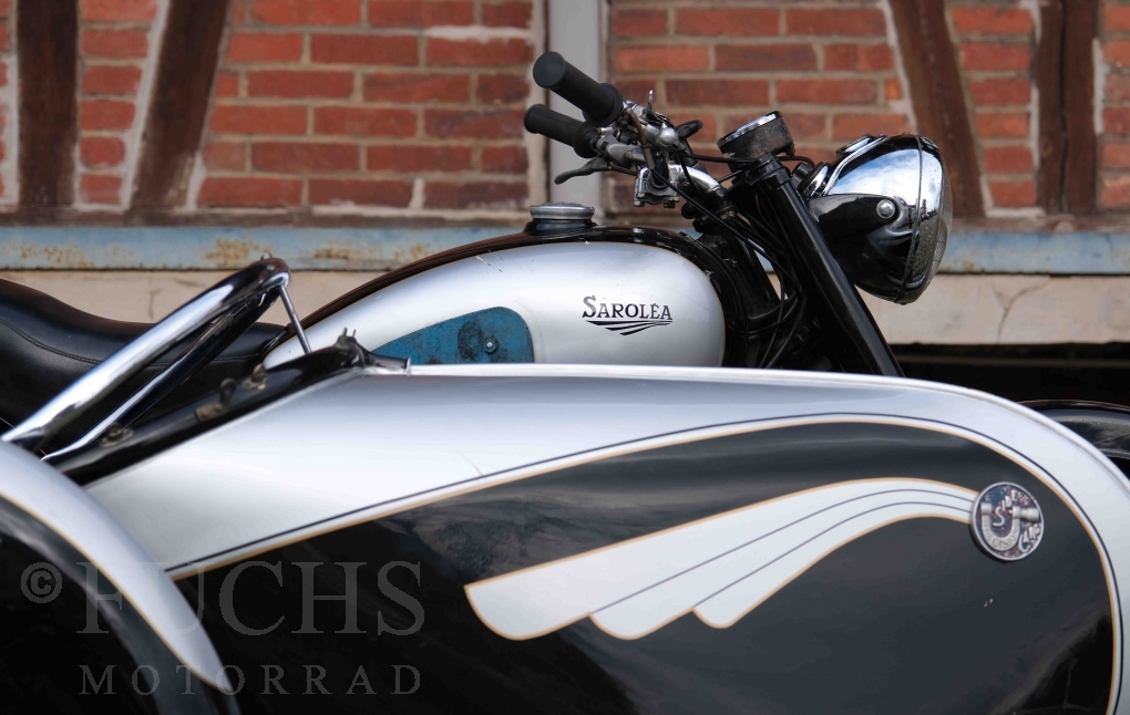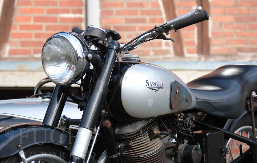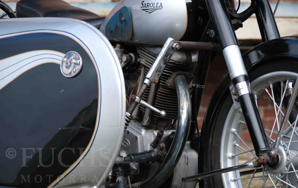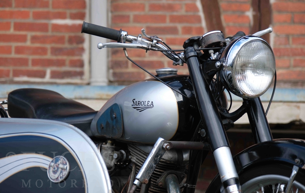 The Sarolea company was founded in Belgium in 1898. In the first few decades, Sarolea was able to make a name for itself with a range of different products. These were bicycles with an auxiliary motor called Kerry around 1905. In the 1920s, the first 500 was introduced. From then on, sports bikes, touring bikes and super sports bikes were offered. Sarolea ceased production in 1960. Our combination of the 600 cc Grand Tourisme and the Precision SS Luxery is in need of restoration.