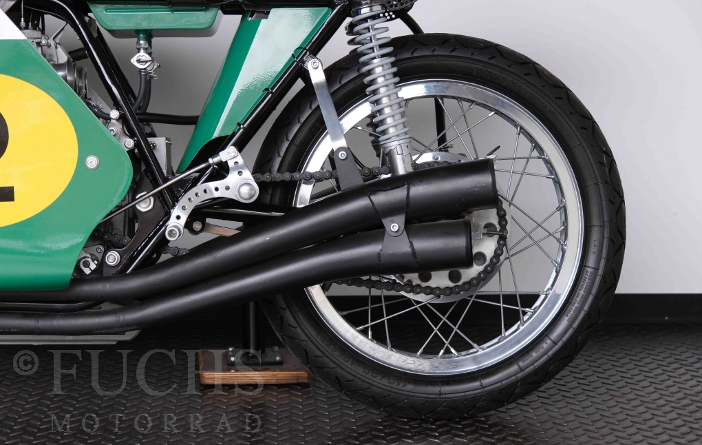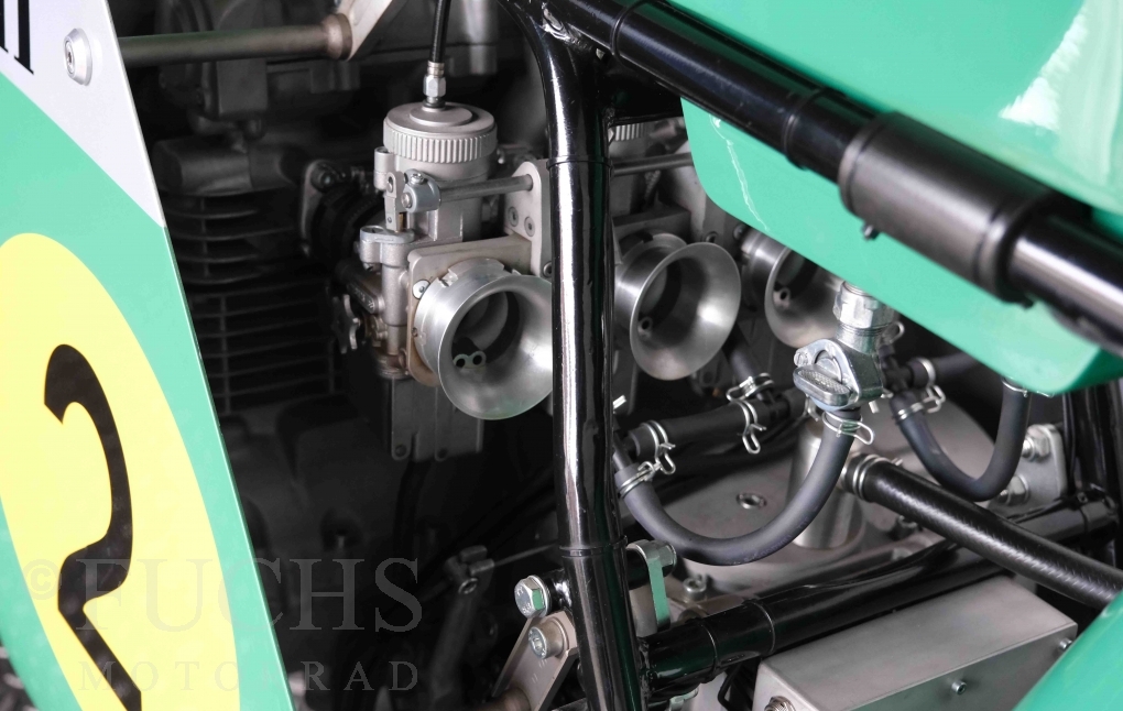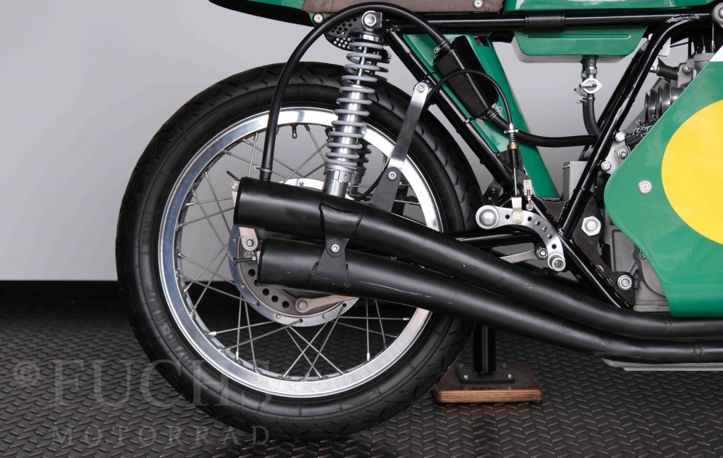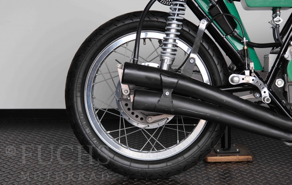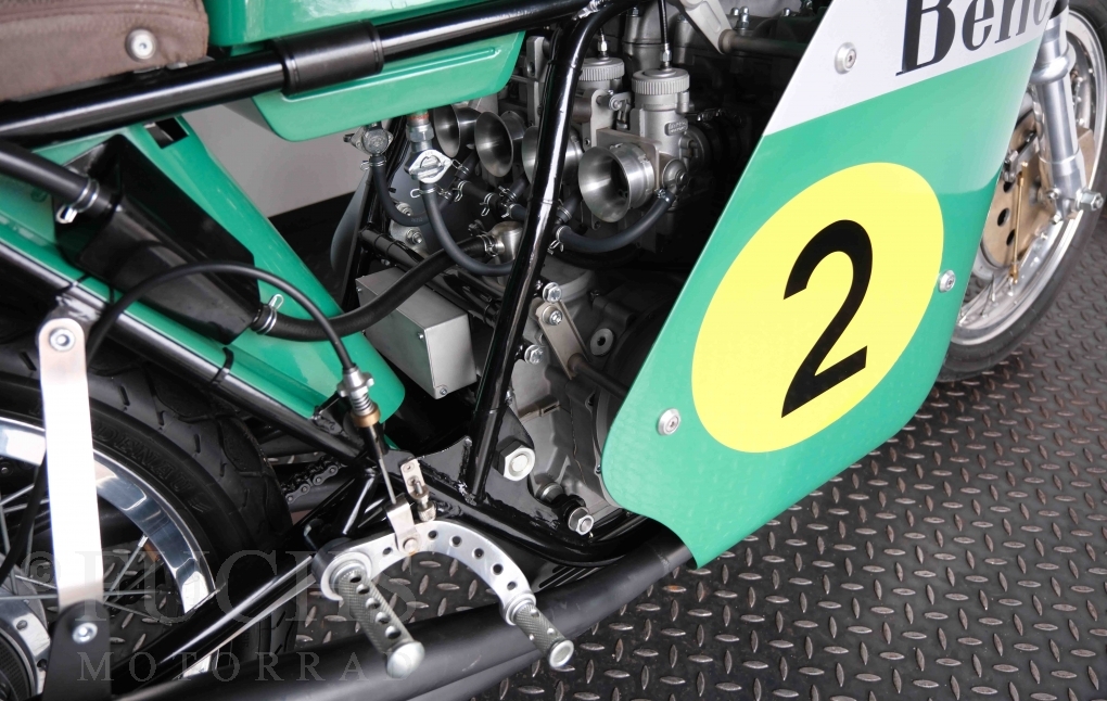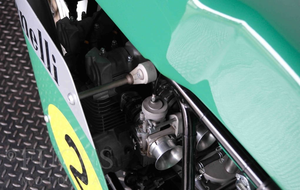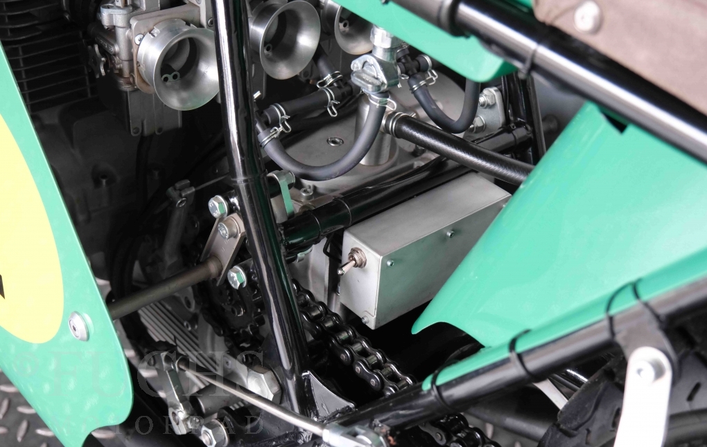 Cerani front fork, Cerani brake system, Veglia rev counter, 36mm Dellorto carburettor, Mercury magnet ignition, Kawasaki Z 550 engine with powering kit to 605 ccm. Wiseco pistons, modified camshaft, harder valve springs, dry clutch, the oil sump is comparable to the original sump.