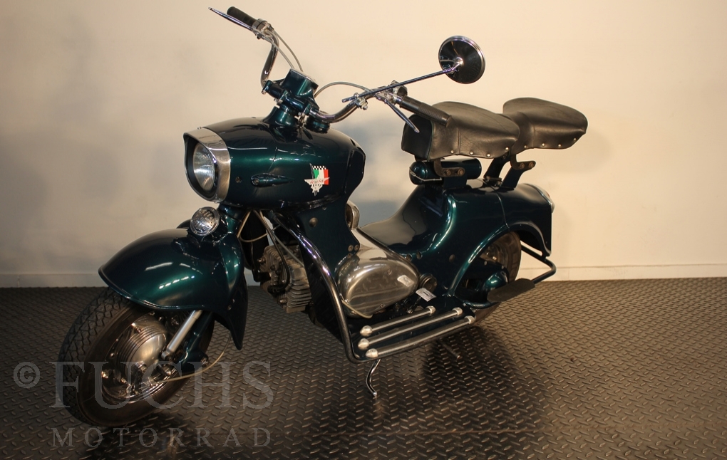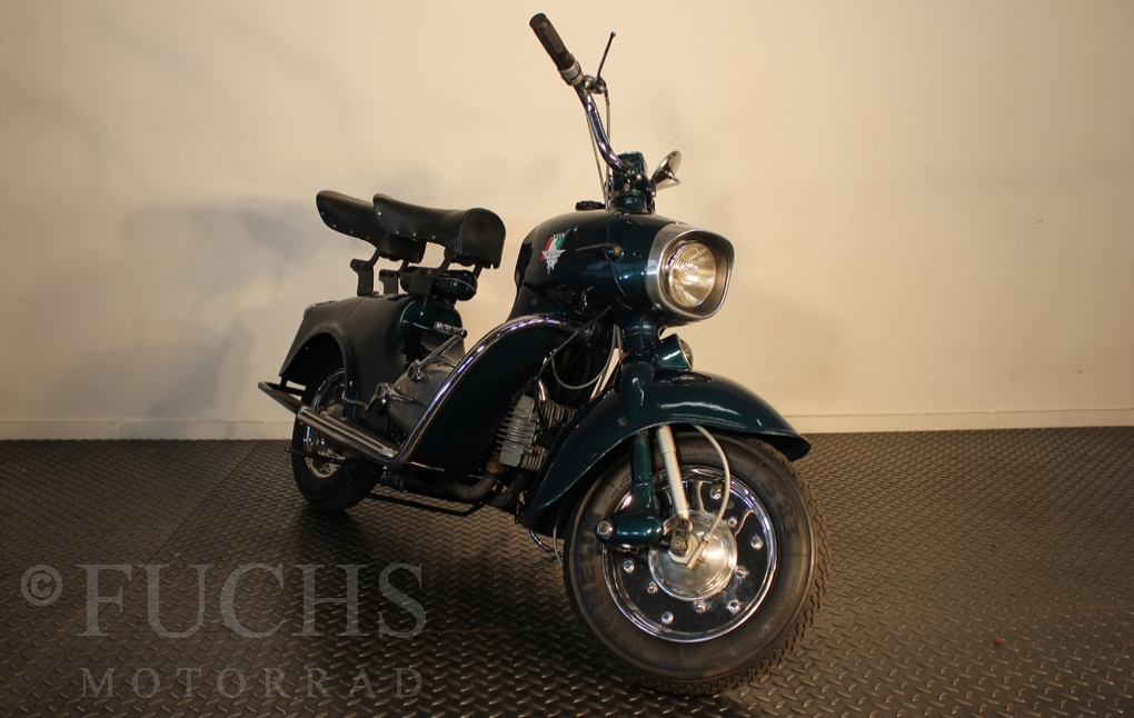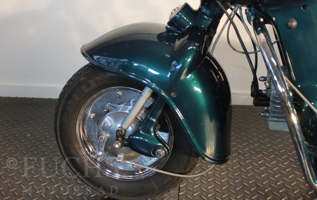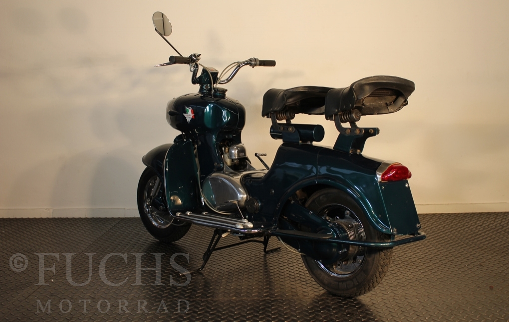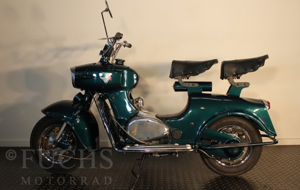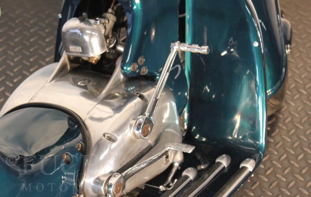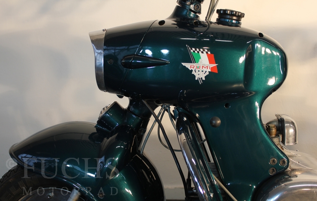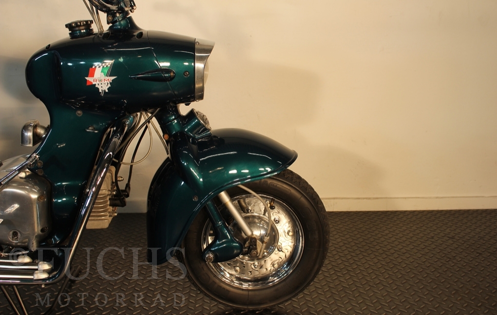 British experts on Rumi scooter has restored the Fomichino Sport. The special features include the original spot color "British Racing Green" Sport cylinder (nikasilcoated from 1959) Double Column installed (side and center stand) brake light and the front shock absorber, which is ideal for the Durpid of Rome sidecar.