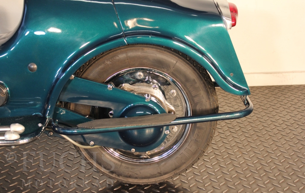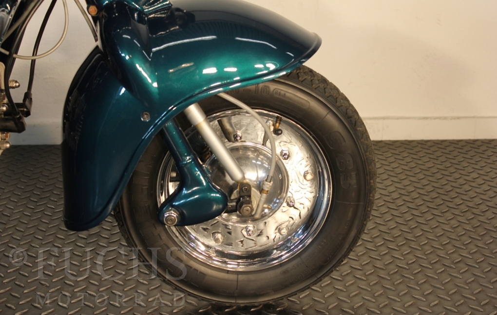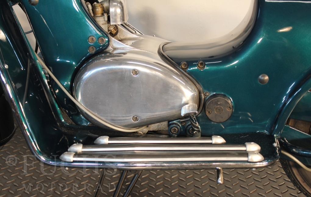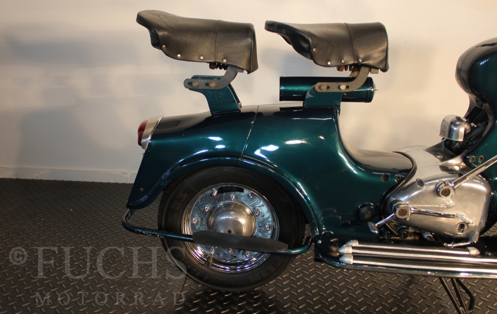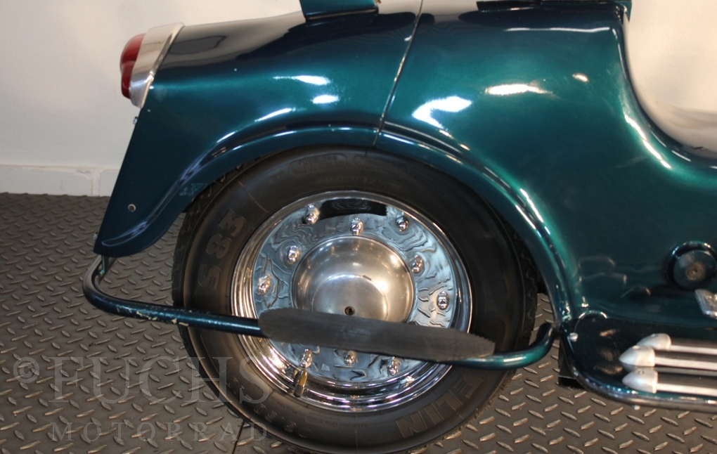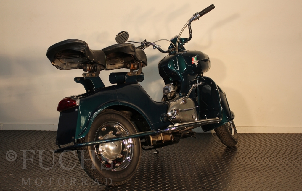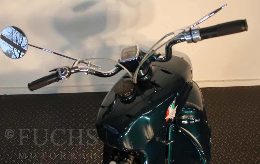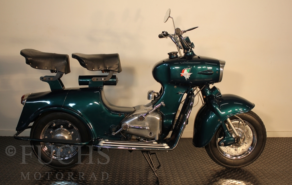 British experts on Rumi scooter has restored the Fomichino Sport. The special features include the original spot color "British Racing Green" Sport cylinder (nikasilcoated from 1959) Double Column installed (side and center stand) brake light and the front shock absorber, which is ideal for the Durpid of Rome sidecar.