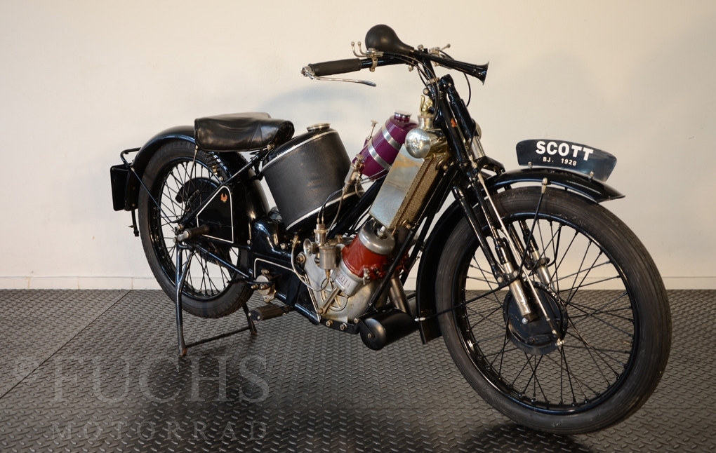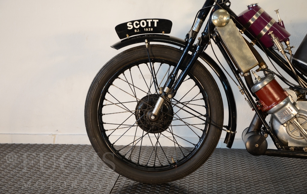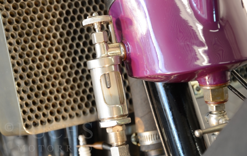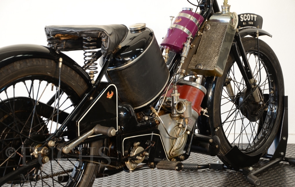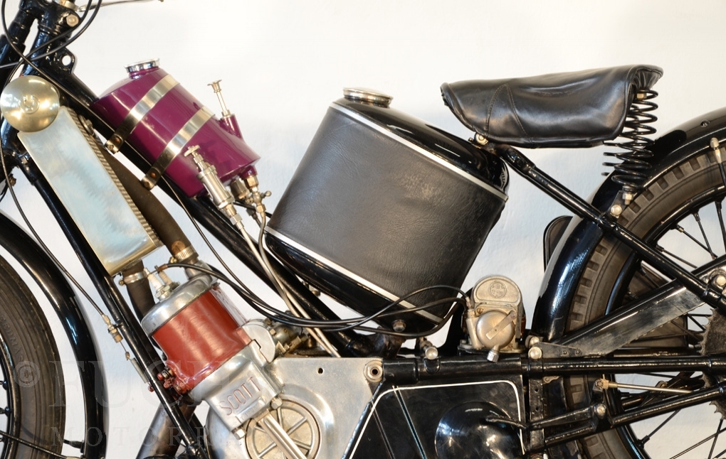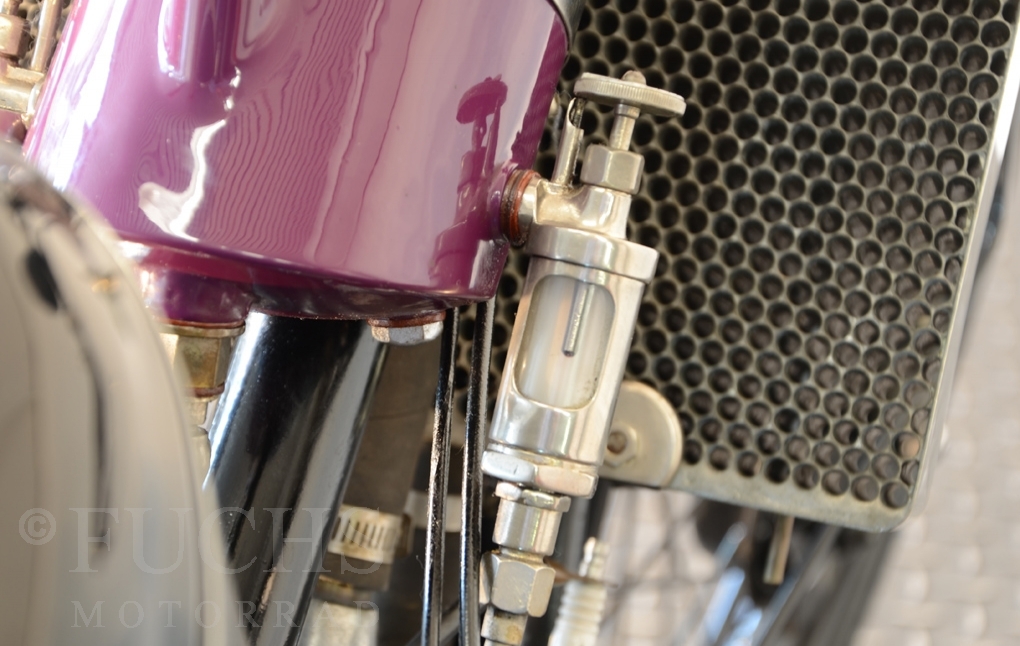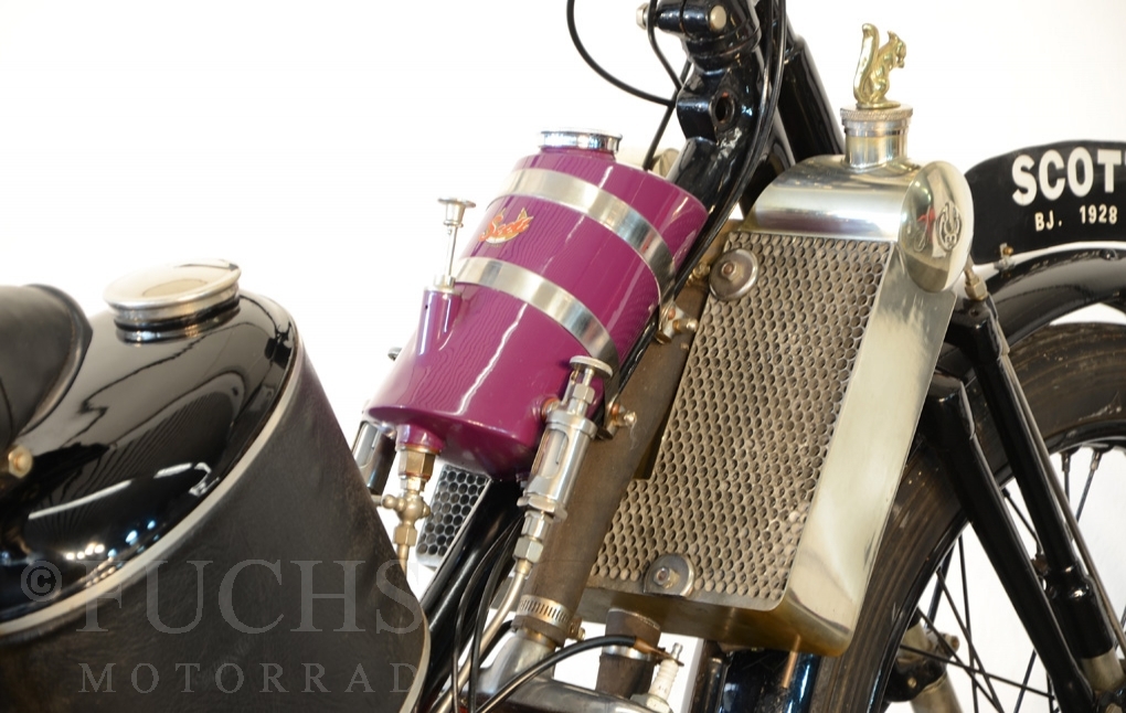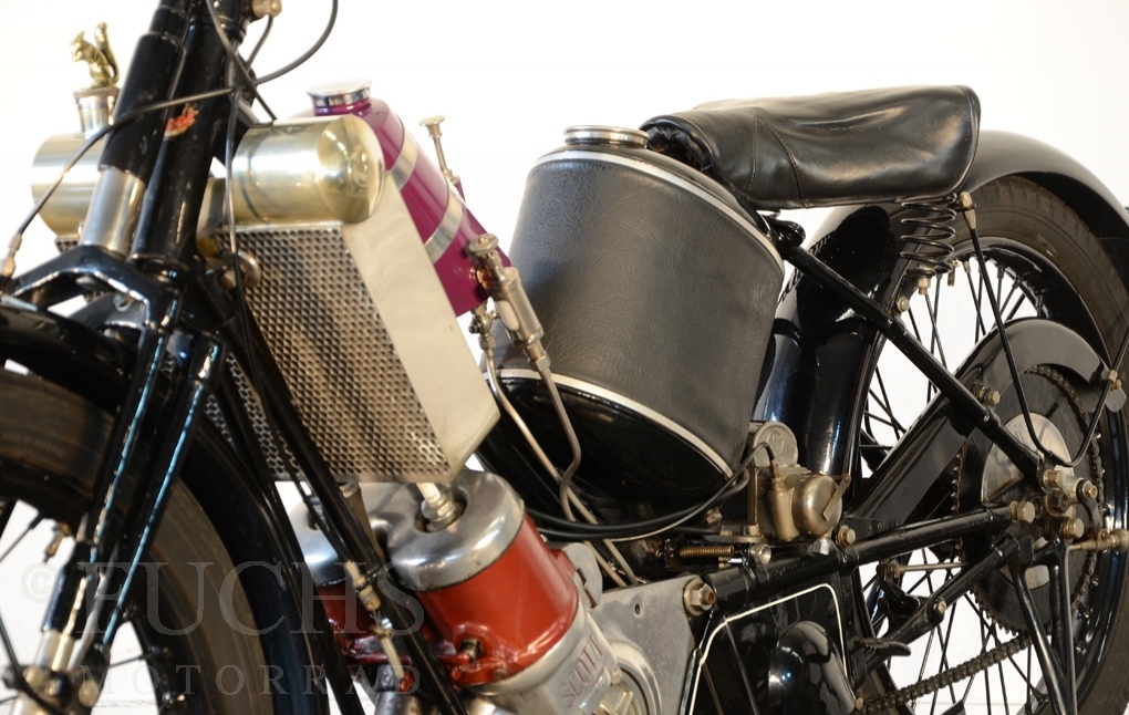 The droplet oiler is in ready to ride condition. The Scott is a two-cylinder two-stroke parallel with water cooling. The Scott offers some features for its time. These include a special 2-speed gear mechanism. 5 chains: two primary chain, a rear chain, a chain for the magneto and the chain for Kickstarter. The engine works with a three-channel cross-flow purging. More than 100 km/h are possible