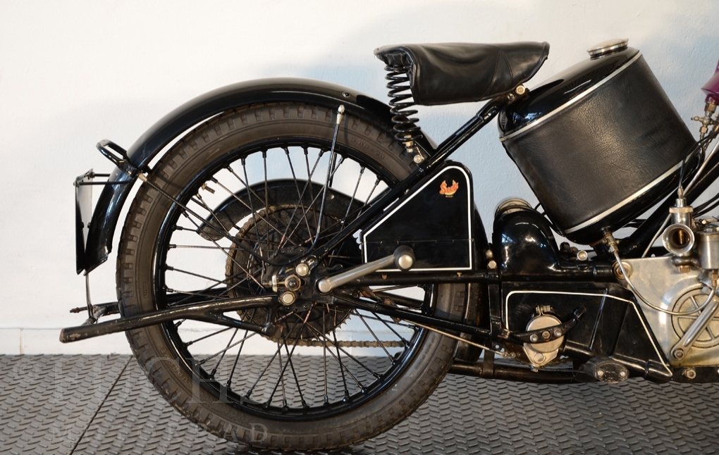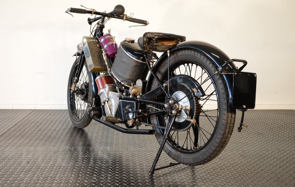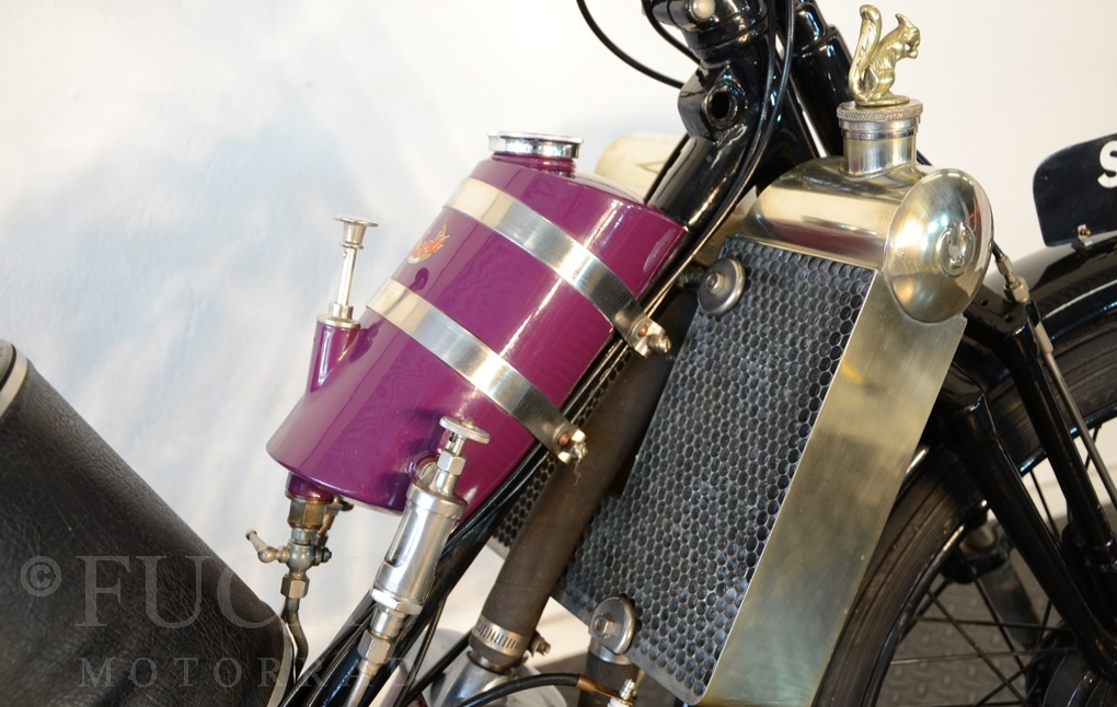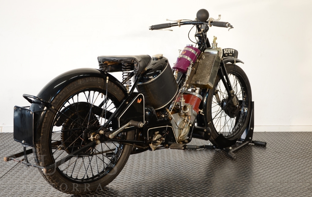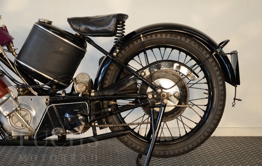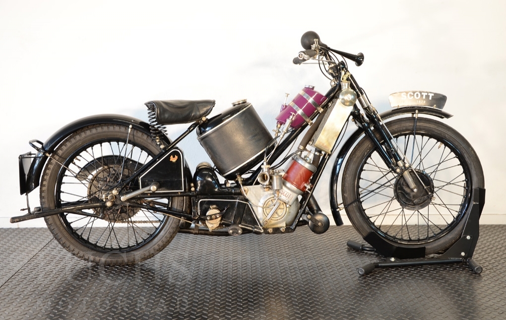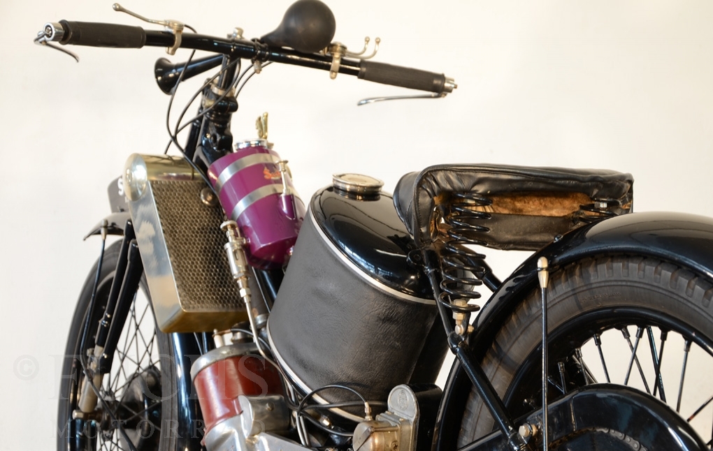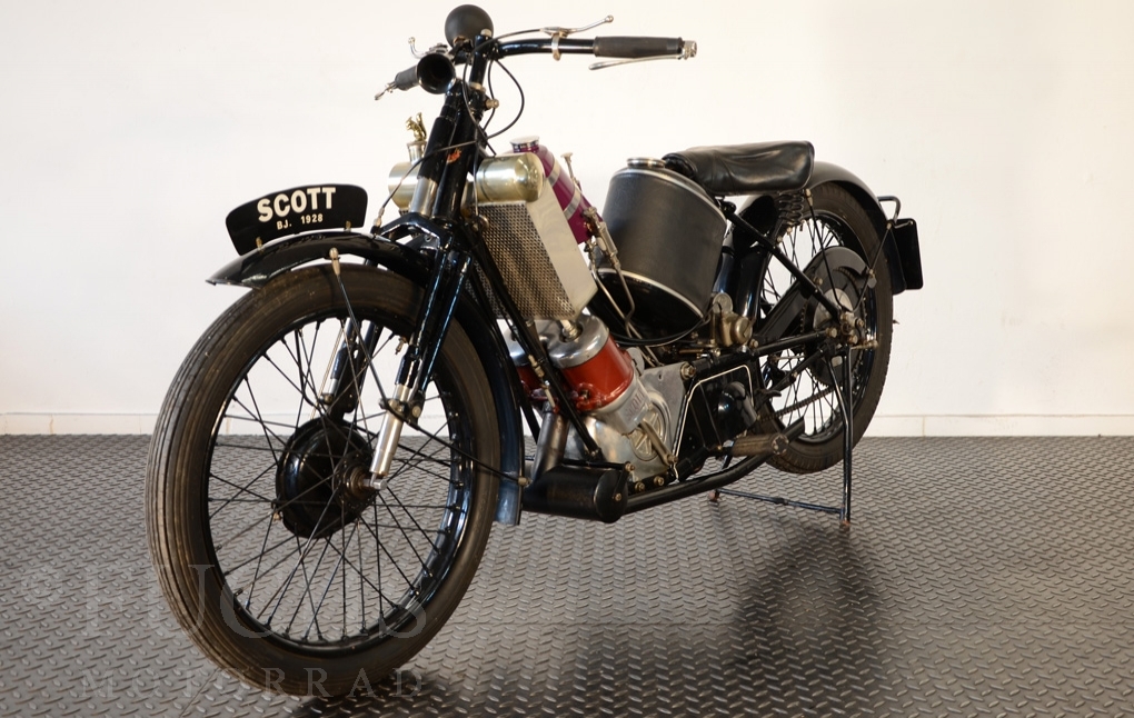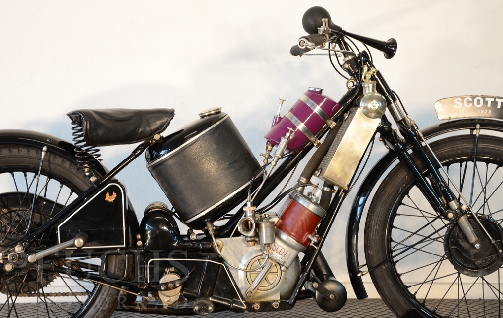 The droplet oiler is in ready to ride condition. The Scott is a two-cylinder two-stroke parallel with water cooling. The Scott offers some features for its time. These include a special 2-speed gear mechanism. 5 chains: two primary chain, a rear chain, a chain for the magneto and the chain for Kickstarter. The engine works with a three-channel cross-flow purging. More than 100 km/h are possible