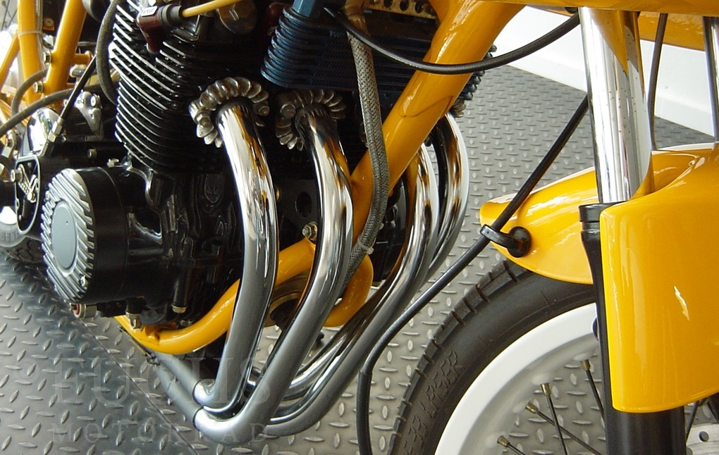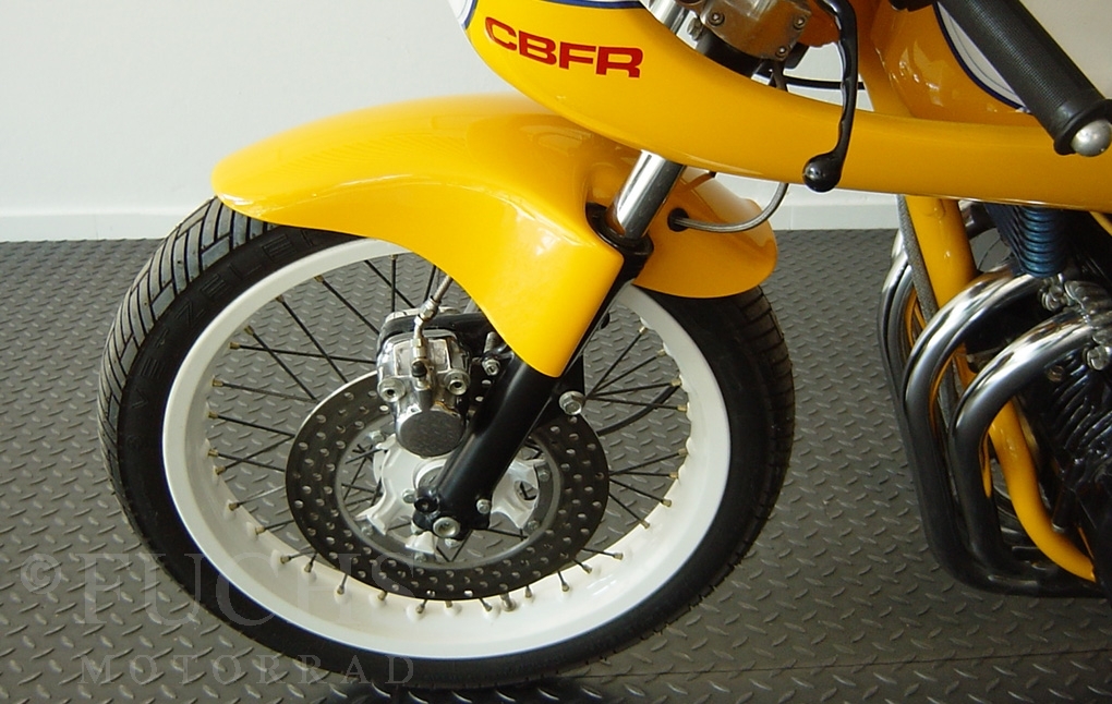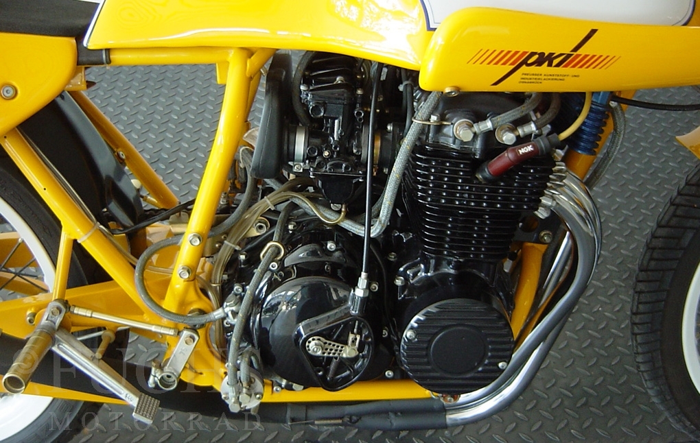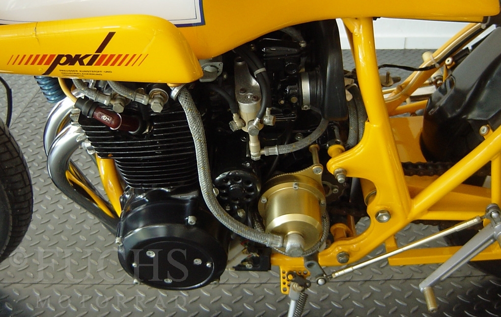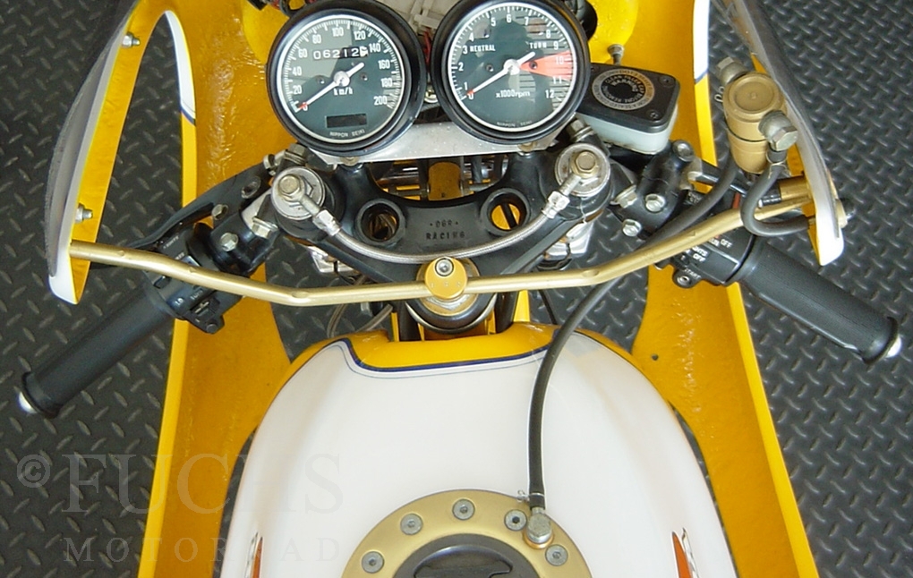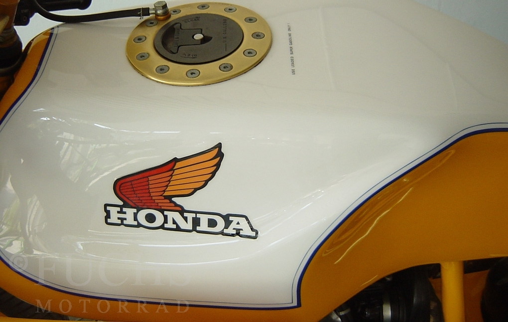The yellow CB 400 was built by Dirk Grabowski Racing. Camshaft and pistons are from Yoshimura, 22mm carburettor, electronic ignition, better clutch, oilcooler, oilfilter outside